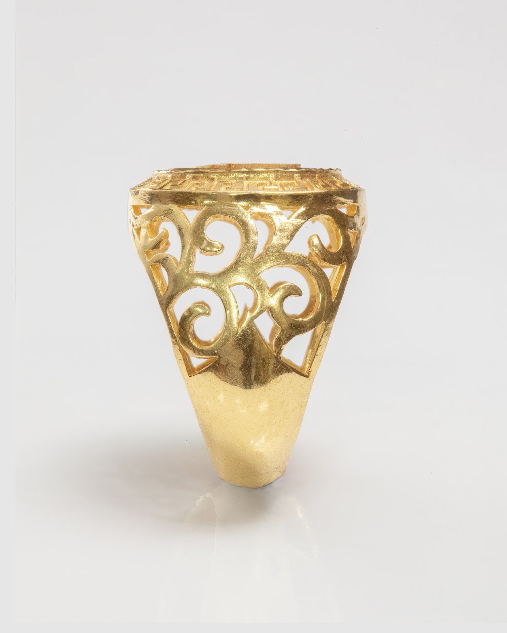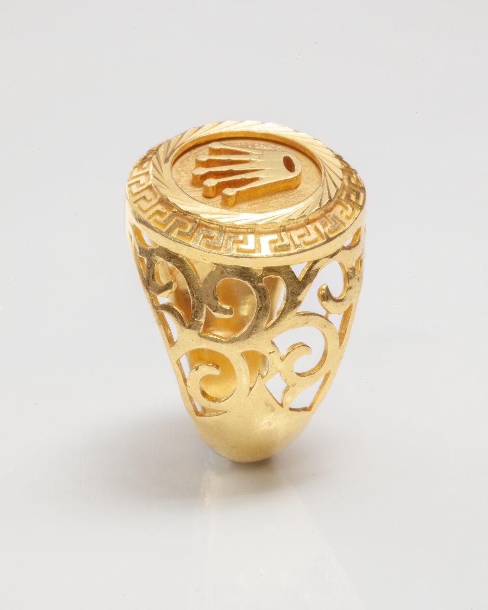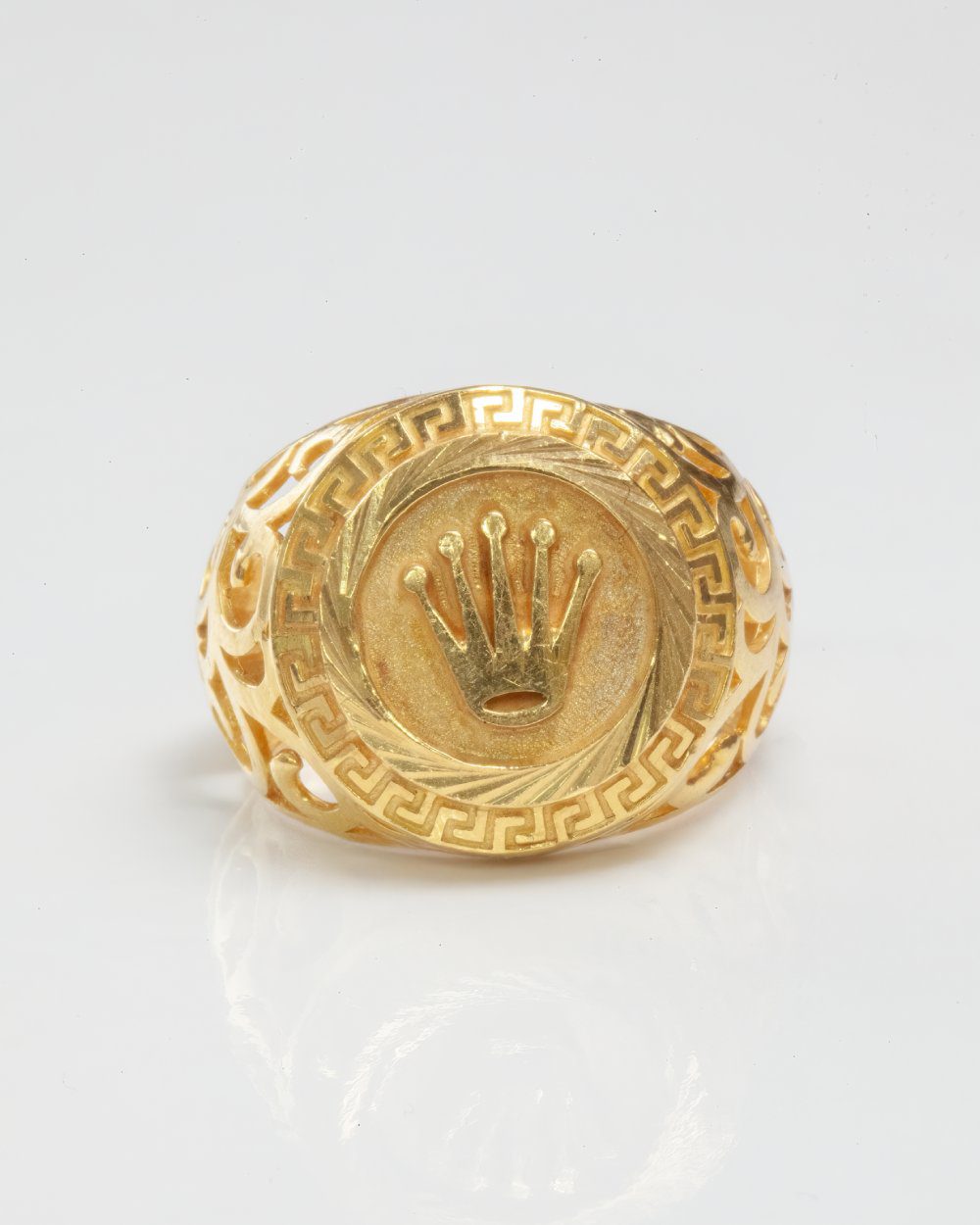 Crafted in pure 22K solid gold, this bold ring is a true symbol of prestige and luxury. The centerpiece features a raised crown emblem, representing power, success, and timeless elegance. The design is framed with a classic Greek key border, while the sides showcase intricate cut-out swirls that add refinement and uniqueness. This masterpiece blends traditional craftsmanship with a modern, regal appeal.