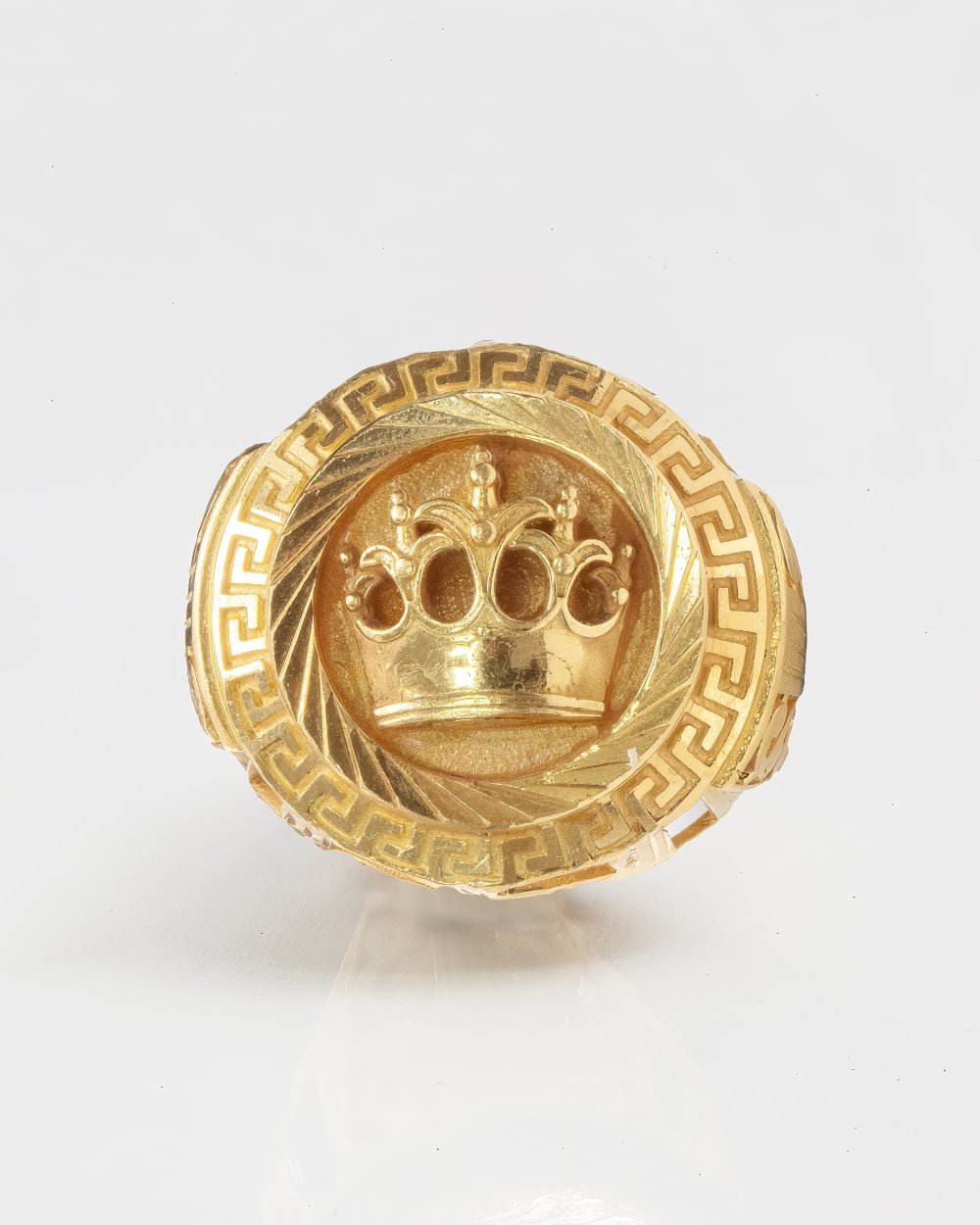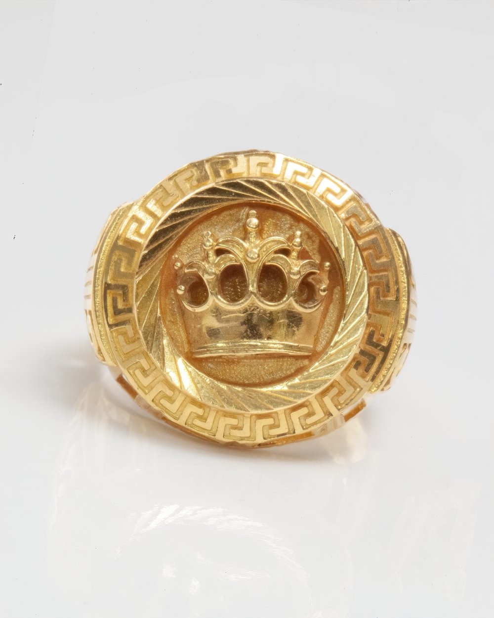 Exude power and prestige with this exquisite 22K solid gold ring, featuring a bold raised crown emblem at its center. Framed with a timeless Greek key border and accented with diagonal cut patterns, this design combines elegance with authority. The crown symbolizes leadership, strength, and success, making this piece a perfect choice for those who value heritage and luxury.