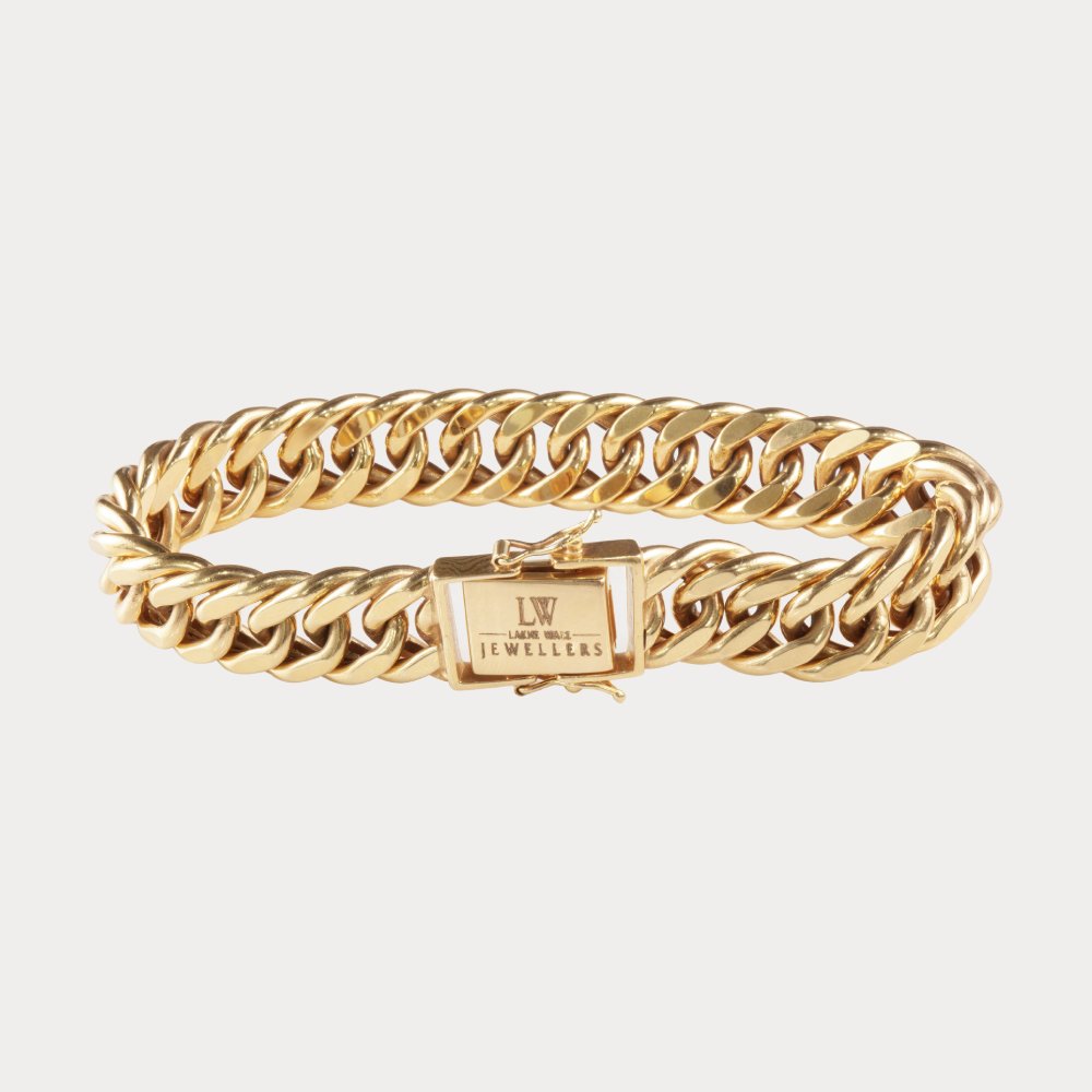 This bold 22K solid gold Cuban link bracelet is a statement of power, style, and timeless craftsmanship. Featuring thick interlocking links with a polished finish, it delivers a luxurious look that never goes out of style. The bracelet is secured with a sturdy box clasp engraved with “LW Jewellers”, ensuring both safety and elegance.