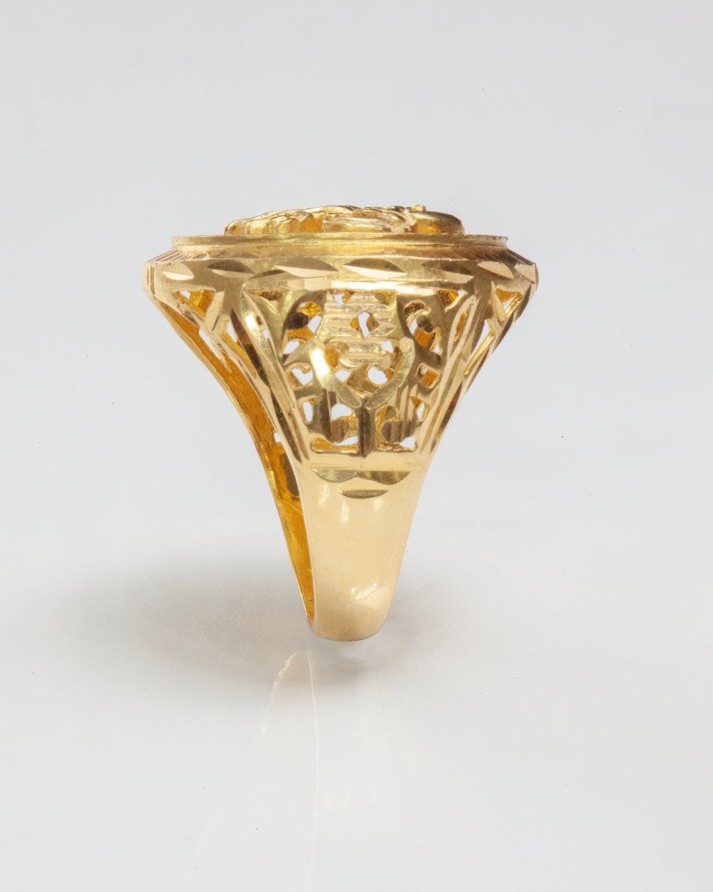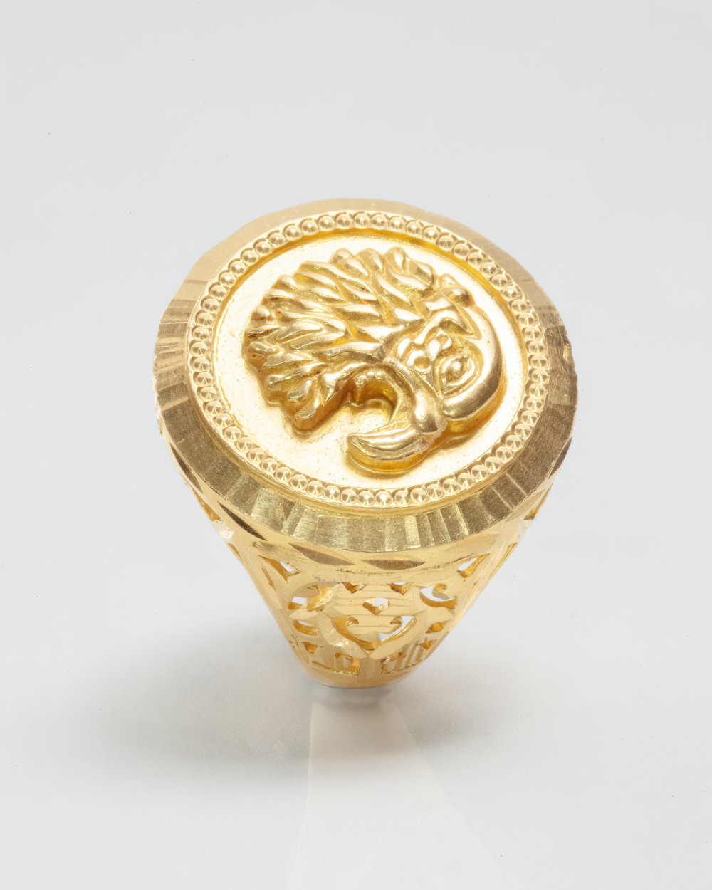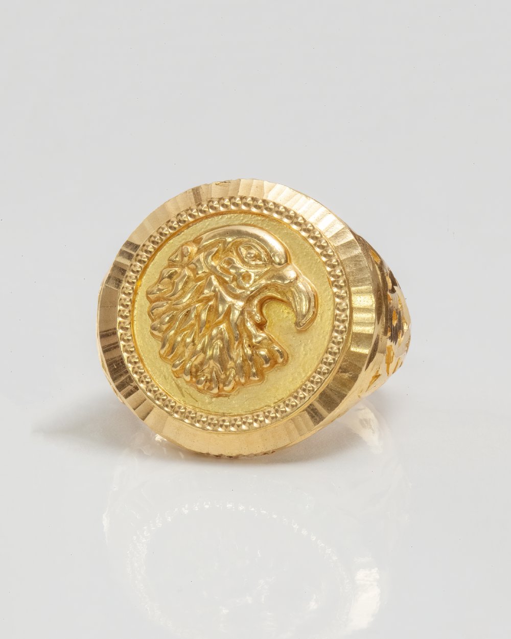 This striking 22K solid gold ring is a true symbol of courage, strength, and freedom. Featuring a finely detailed eagle head engraving at its center, the design radiates confidence and power. The oval face is framed with intricate beaded and ridged borders, while the side shank showcases handcrafted cutwork that enhances its elegance and sophistication. A perfect balance of tradition and bold style, this ring is made to be noticed.