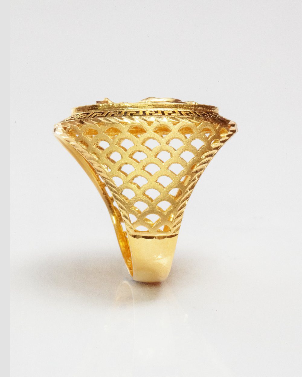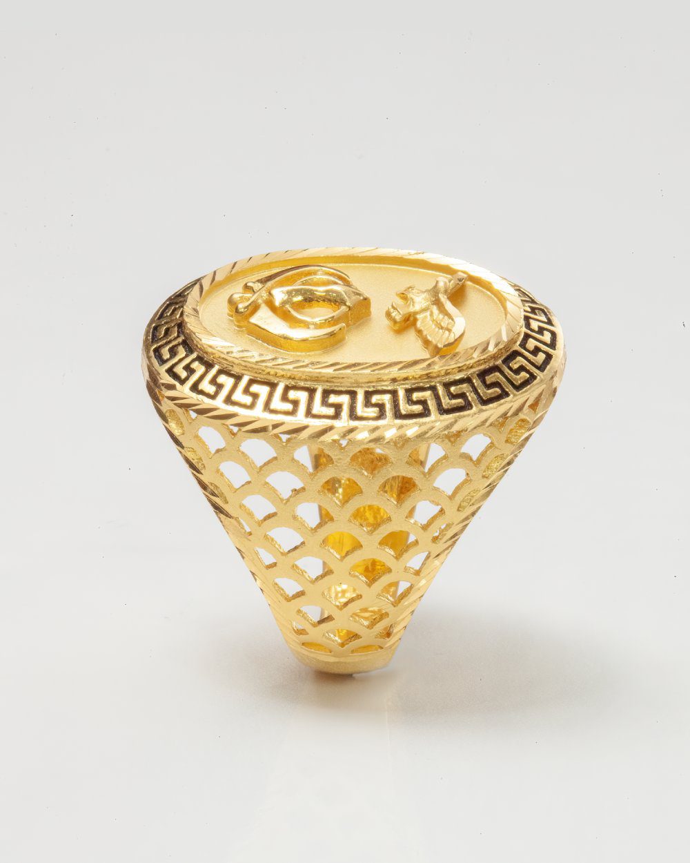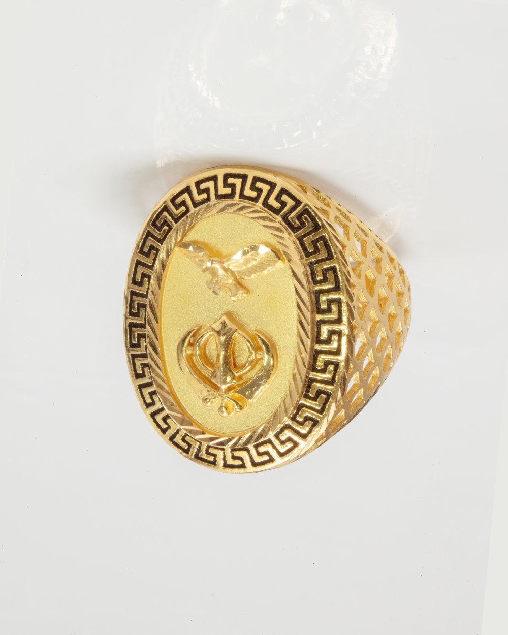 Crafted from genuine 22K gold, this statement ring combines deep cultural meaning with timeless craftsmanship. The oval face features two powerful emblems: the Khanda, symbolizing Sikh faith, unity, and strength, and an eagle, representing courage and freedom. A bold Greek key border frames the design, while the lattice-cut band enhances both comfort and style.
