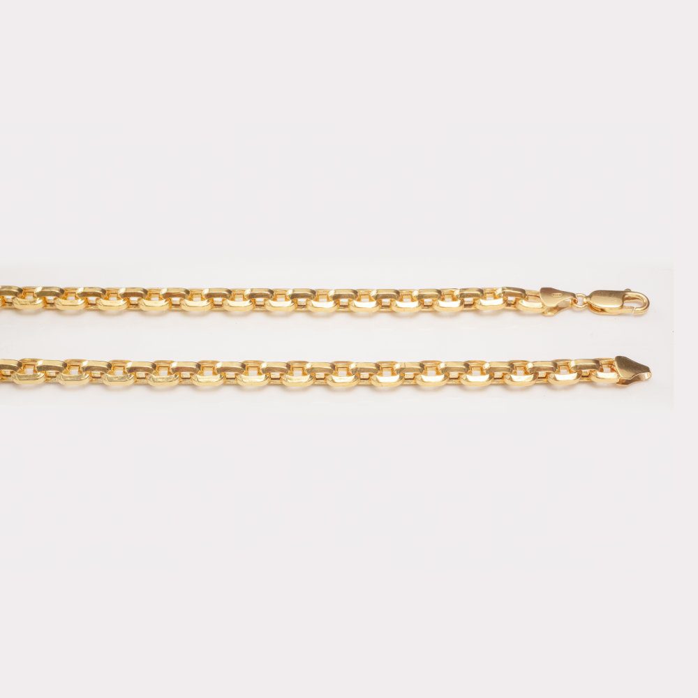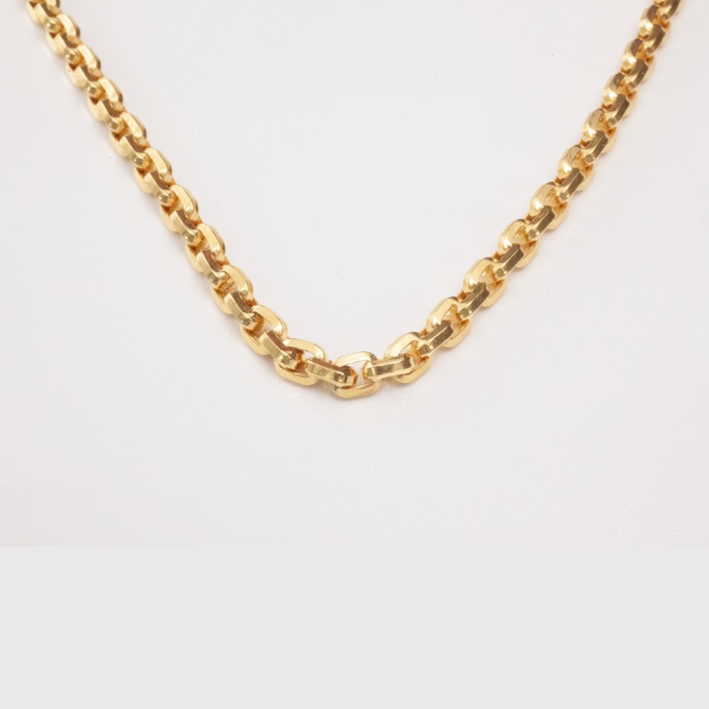 This striking 22K solid gold chain necklace features a bold rectangular link design, offering both durability and modern elegance. The wide, polished links create a strong and luxurious look, making this necklace ideal for men who prefer statement jewelry. Finished with a secure lobster clasp, it’s perfect to wear on its own or layered with other pieces for a stylish edge.