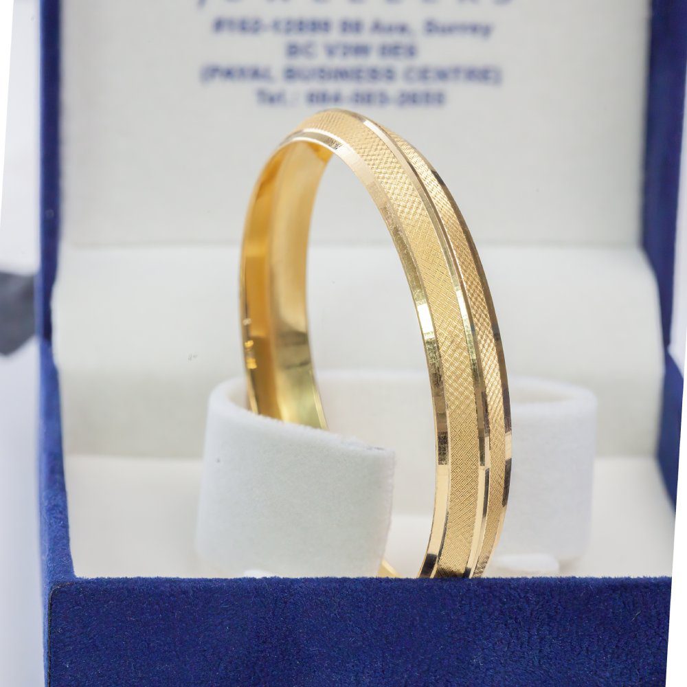 A perfect blend of tradition and elegance, this 22K solid gold Kada bracelet features a detailed cross-hatch textured design bordered by polished edges. Handcrafted with precision, it offers both durability and sophistication, making it an ideal piece for weddings, religious ceremonies, or daily wear. The bold structure of the Kada symbolizes strength, prosperity, and cultural pride.
