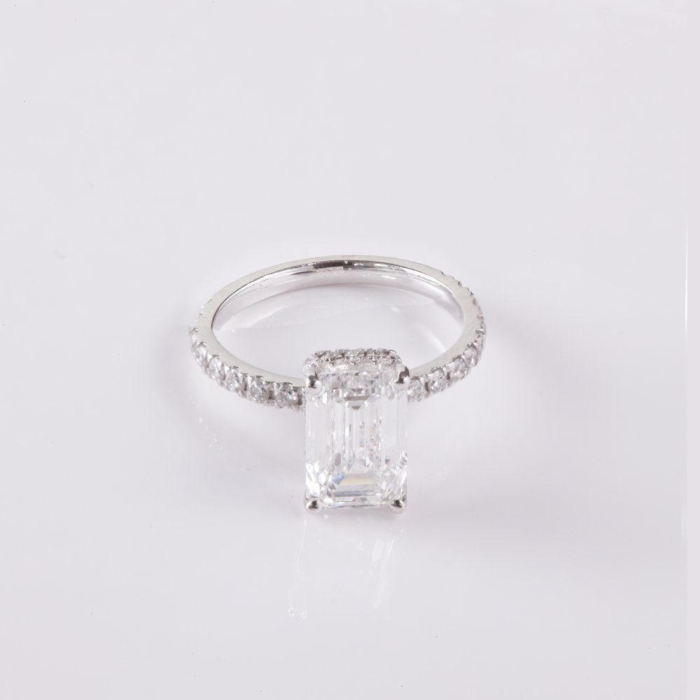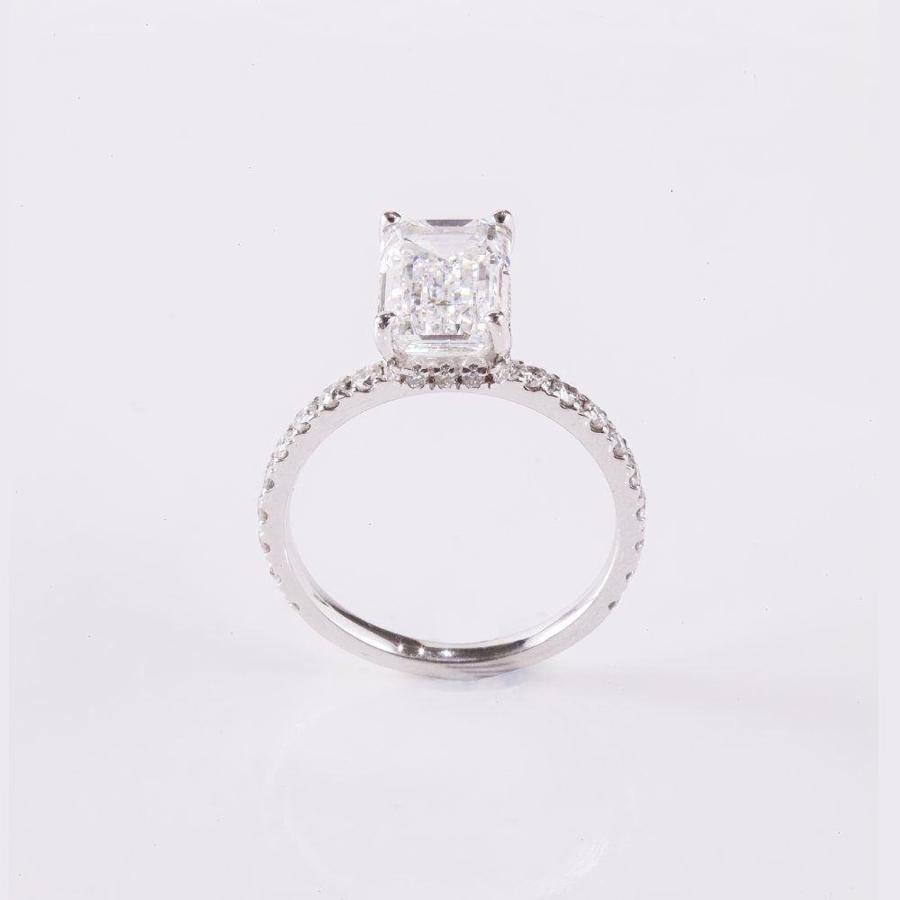 Elegant and timeless, this stunning engagement ring features a dazzling emerald-cut center diamond set in a secure four-prong setting. The brilliance of the centerpiece is enhanced by a delicate pavé diamond band, adding extra sparkle and sophistication from every angle. Crafted in luxurious 18K white gold, this ring combines modern refinement with classic romance, making it the perfect symbol of everlasting love.