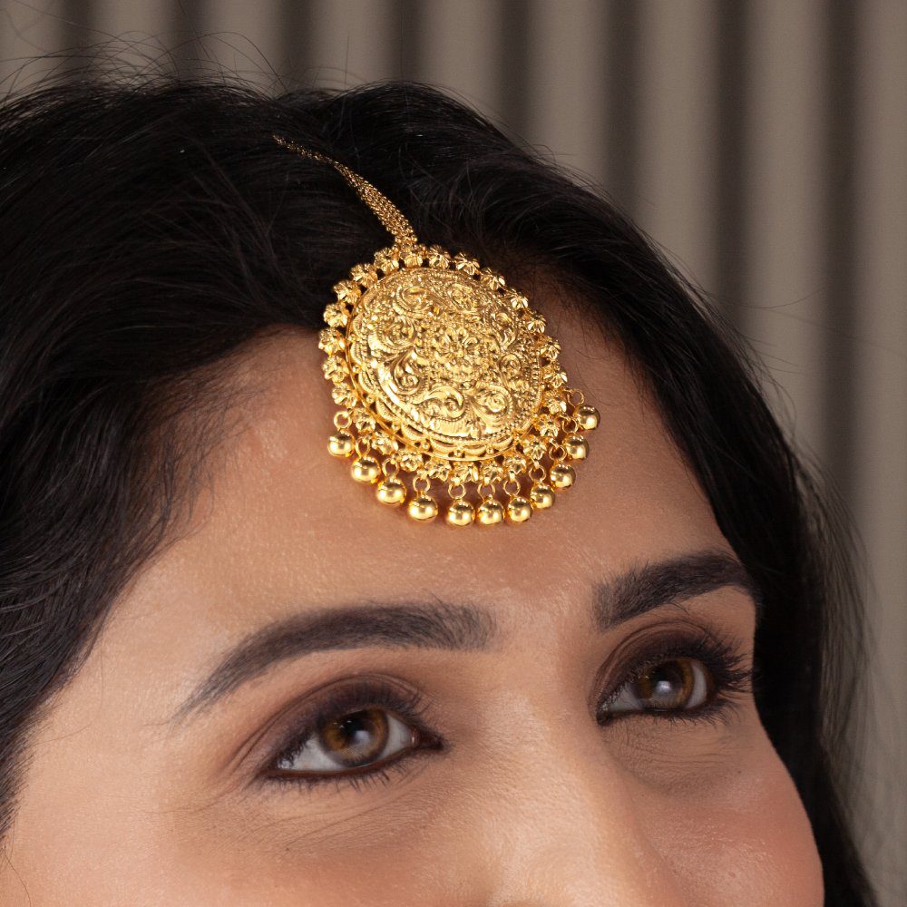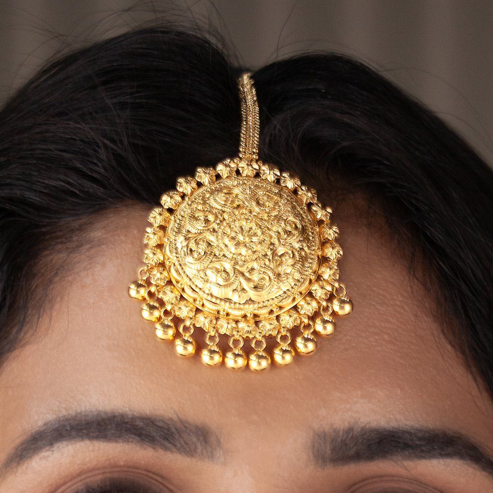 This exquisite 22K solid gold Maang Tikka is designed with a bold circular centerpiece featuring intricate antique-style carvings. Surrounded by detailed beadwork and finished with golden ball hangings, it adds depth, texture, and traditional charm. Perfect for brides who want to embrace timeless heritage with elegance.
