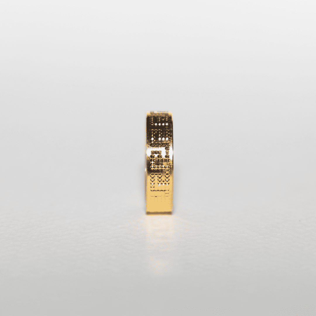 Each segment of the design is finely dotted for a subtle texture that enhances its brilliance under light. Its smooth inner surface ensures a comfortable fit, making it perfect for daily wear or as a statement of timeless sophistication.