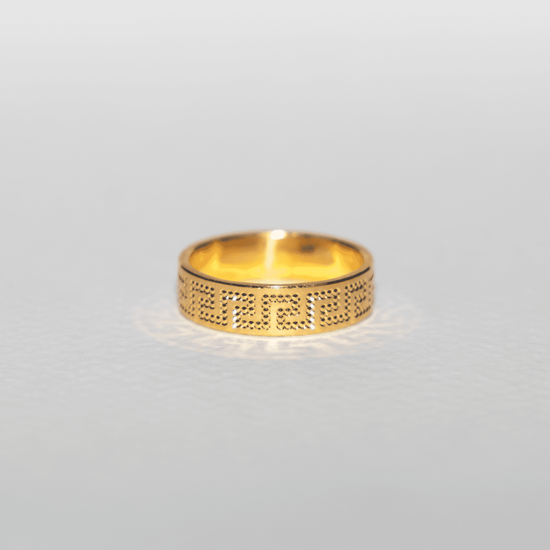 The Greek Key Textured Gold Band Ring pays homage to ancient artistry with a modern touch. Meticulously handcrafted in 22K solid gold, this piece showcases the classic meander (Greek key) motif — symbolizing infinity, unity, and eternal flow.