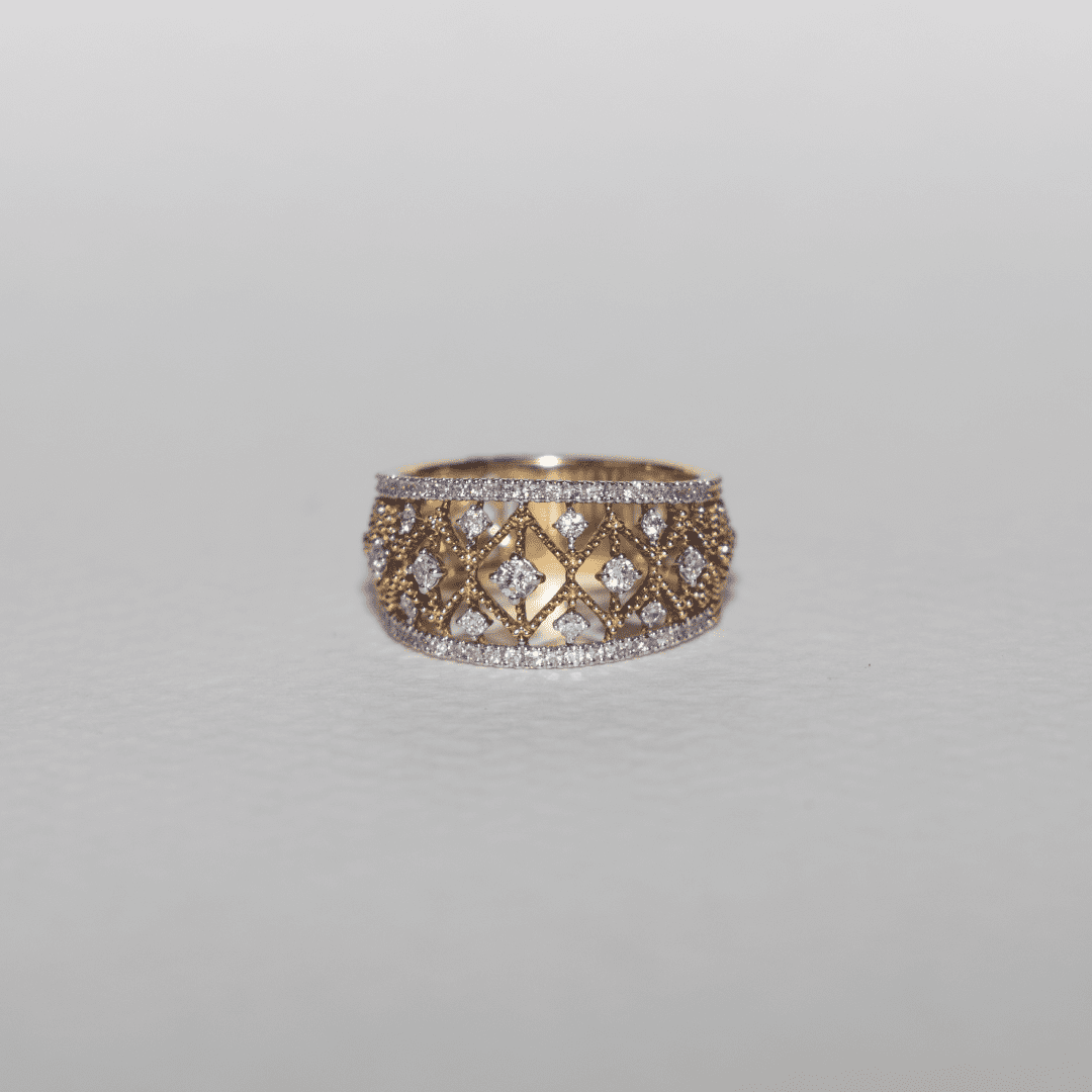 The Lattice Diamond Pattern Gold Band Ring is a testament to meticulous artistry and timeless elegance. Handcrafted in 18K dual-tone gold, this piece showcases a regal lattice design accentuated with brilliant round-cut diamonds set in a symmetrical pattern. The pavé-set diamond borders enhance its sparkle, while the intricate detailing reflects exceptional craftsmanship.