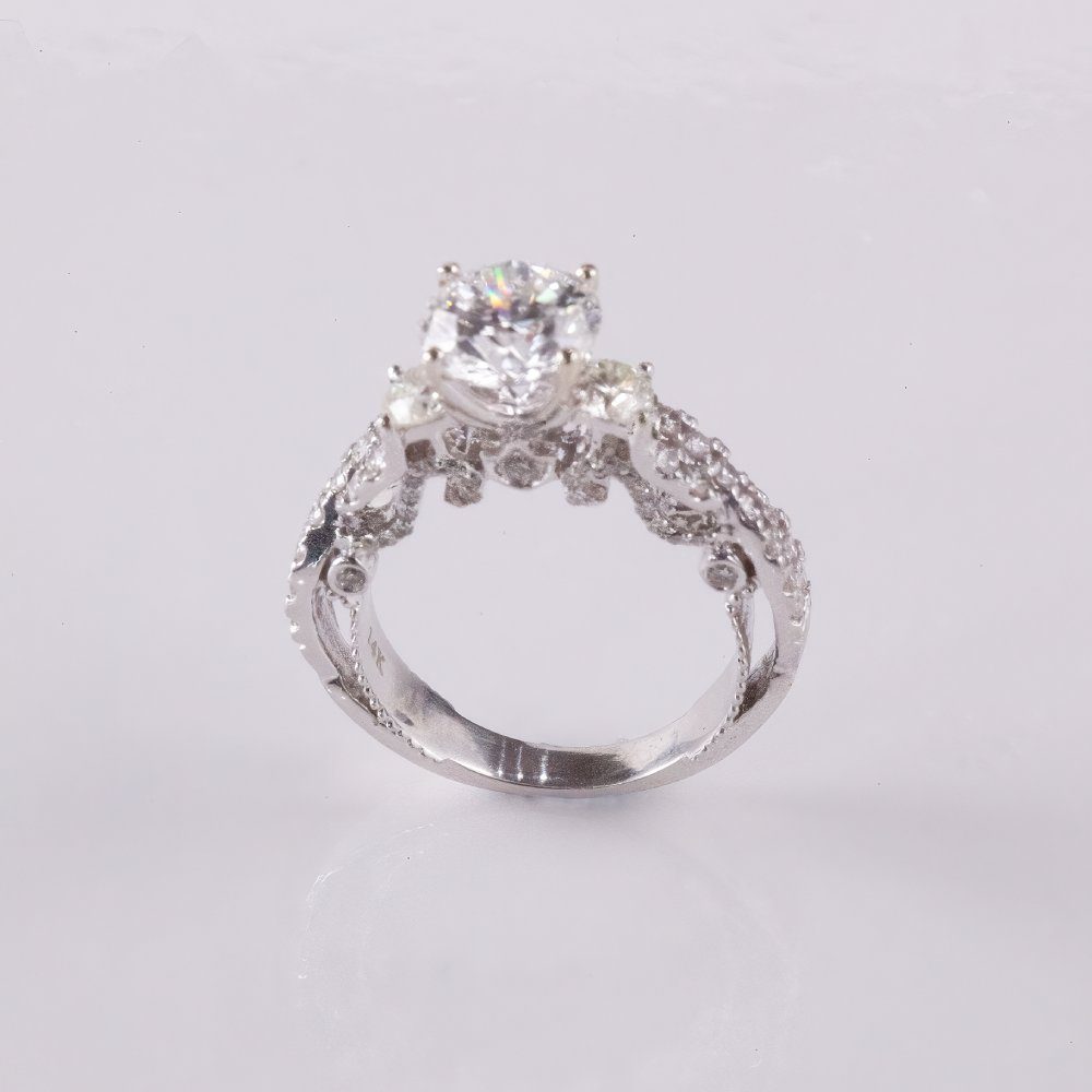 This breathtaking round brilliant-cut diamond ring combines modern sparkle with vintage-inspired charm. The center stone is secured in a classic four-prong setting, radiating unmatched brilliance. The band features an intricate pavé and milgrain design, adorned with additional diamonds for a glamorous, heirloom-worthy look. Handcrafted in 18K white gold, this ring is the perfect balance of elegance, artistry, and timeless love.