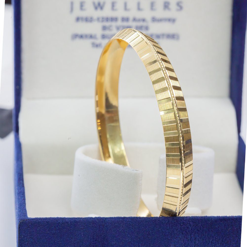 This elegant 22K solid gold Kada bracelet is crafted with precision and tradition in mind. Featuring a bold striped textured design around the band, it reflects fine craftsmanship and timeless cultural heritage. The Kada’s strong yet refined structure makes it perfect for both daily wear and special occasions, symbolizing strength, prosperity, and elegance.