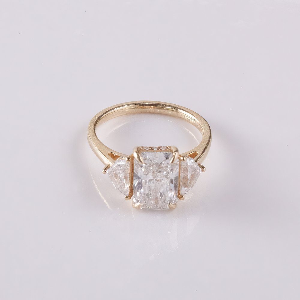 Celebrate your love with this timeless three-stone engagement ring crafted in luxurious 18K yellow gold. At its center shines a radiant-cut diamond, flanked by two perfectly matched side diamonds that enhance its brilliance and symbolize the past, present, and future of your journey together. The sleek band design allows the diamonds to take center stage, creating a look of elegance and sophistication.