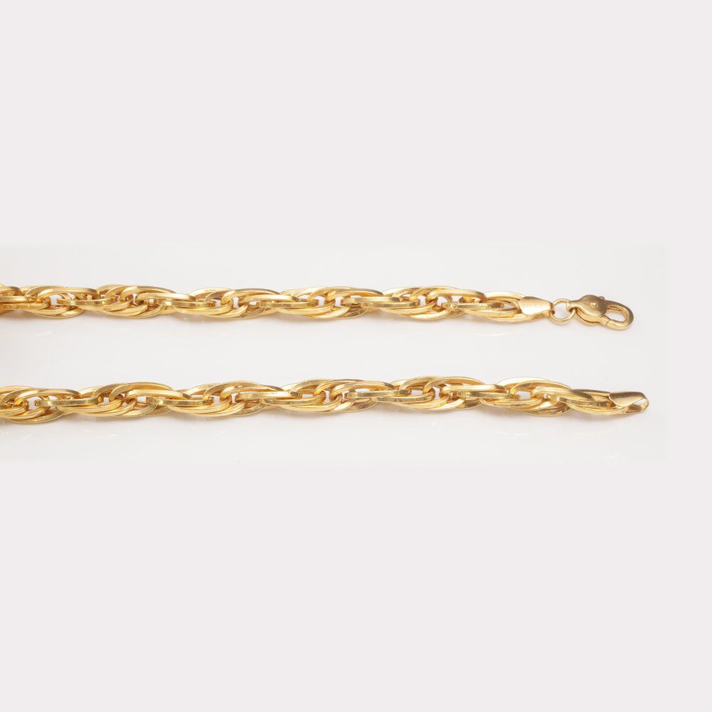 This elegant 22K solid gold chain necklace features a classic rope-style twisted interlink design, symbolizing strength and unity. The interwoven links create a textured, durable, and luxurious look with a brilliant polished finish. Completed with a secure lobster clasp, this necklace is versatile enough to wear on its own or paired with a pendant.